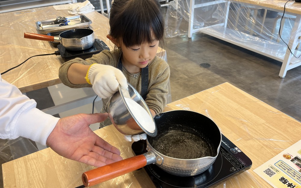 子供がYouTubeで見た飴の作り方に興味を持ち、体験できるとこを探していたところ、ここの評判が良さそうで申し込みしました!評判通り親切で、五歳の子供でも楽しむことができました! 何より、作った抹茶飴が美味しすぎて、家族に大好評です!かなりの量を作りましたが一週間以内に無くなりそうです。美味しかったので、また体験しに行って飴を持って帰りたいです。 ここから下は公表しなくていいですが、お子さんの参加多いと思われますので、小さい子供用の軍手と、踏み台があれば嬉しいです。(京都府 30代 女性 美味しい!さん)