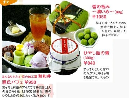 店内メニューの『源氏パフェ』と共に代表商品の『ひやし飴の素』と『贅沢抹茶飴「碧の極み」~濃いめ』がクローズアップされました。