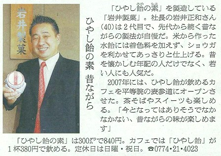 | 宇治伏見walker(2010年3月) | 宇治平等院 門前さんぽ特集ページにて、直営店「はんなりかふぇ・京の飴工房 憩和井 平等院店」が紹介。