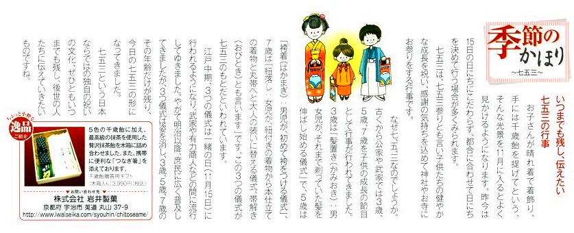 | けんこう便り(11月号) | 久光製薬の健康情報誌、「いつまでも残し、伝えたい七五三の行事」の記事とともに弊社の『千歳飴』が紹介されました。