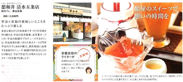 | 京都ぴあ(2013~2014) | 「はんなりかふぇ・京の飴工房 憩和井(iwai)清水五条店」が紹介。『ひやしあめゼリー』『ひやしあめ』『ひやし飴の素』がピックアップ。