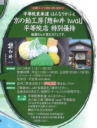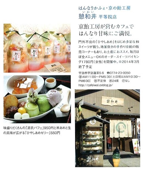 | JAFMate(ジャフメイト) | 「はんなりかふぇ・京の飴工房 憩和井(iwai)平等院店」が紹介。「宇治の名店特集でおいしい初夏を!」の特集で掲載。