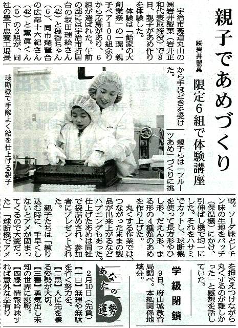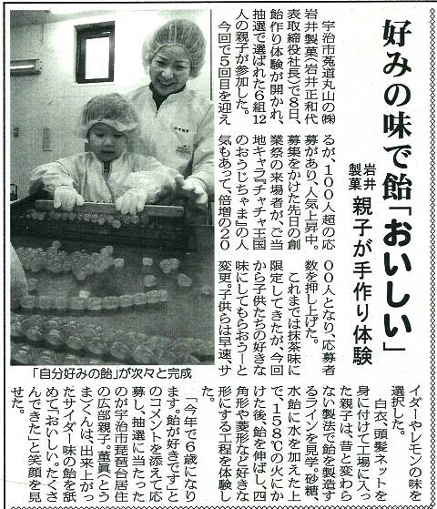 | 菓業食品新聞・城南新報・洛南タイムス | 「飴屋の大創業祭」の企画の一つでもあり、毎年恒例の「親子で飴づくり体験」の記事が紹介されました。