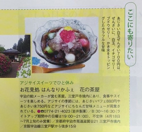 | 旅の手帳(6月号) | 「あじさい寺特集」にて三室戸寺境内「花の茶屋」のあじさい白玉ぜんざいが紹介。
