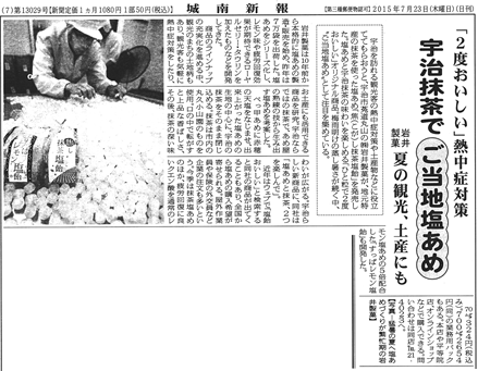 | 城南新報(7/23) | 「焦し抹茶塩飴」と「すっぱレモン塩飴」が紹介されました。
