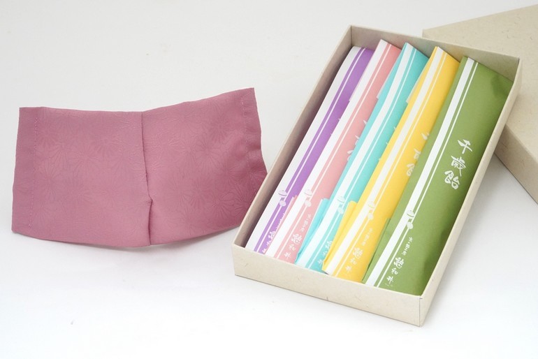 5色の千歳飴とマスクのセット。マスクは子供用と大人用から選択できます。