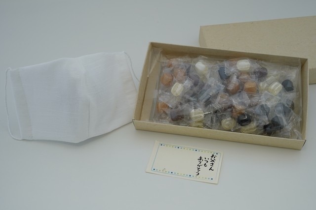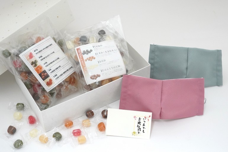のど飴(紀州梅飴、生姜飴、京はんなりのど飴、ハッカ飴)と柄が選べるマスクのセット。