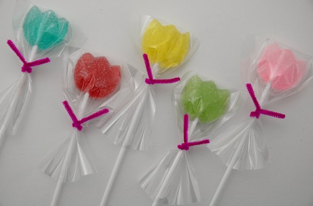 チューリップの形をしたお花の棒付きキャンディです。
