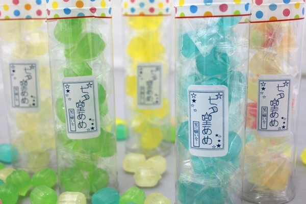 七夕とは、五節句の一つで、織女祭・星祭とも呼ばれます。 7月7日に、牽牛と織女が天の川で年に一度会うといわれる伝説にちなむ祭です。 ささ竹に、願い事を書いた短冊を飾ります。そんな七夕にぴったりなカラフルで楽しい飴を作りました。 イベントの景品やノベルティー、結婚式のプチギフトにも幅広くご利用いただけます。