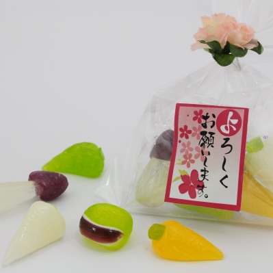「プチお野菜」には、かぶら・人参・ししとう・そら豆・なすのベジタブルキャンディが入っております。 昔ながらの製法でじっくり地釜で炊き上げており、見た目だけではなく味にも定評があります。