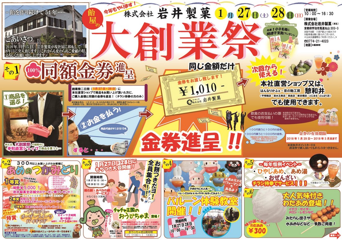 1月27(土)28日(日)本社・工場にて、「あめ屋の大創業祭 2018」を開催いたします! 今年も、バルーン体験教室やお餅つきなど楽しい企画が目白押し♪ 皆様のお越しをお待ちしております!!