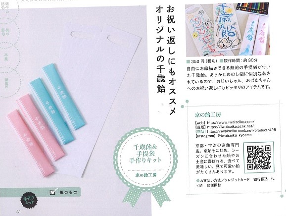 「子どもの逸品一点ものを買うor作る」(2月19日発売)の【七五三の逸品特集】にて「千歳飴」が紹介されました。 手提げ袋は自由に絵が描ける無地になっており、たったひとつしかないオリジナルを作成できます! 皆さんも是非思い思いの手提げ袋を作ってみてはいかがでしょうか? 中身は紅白の千歳飴が2本入りです。味は赤が(苺ミルク)白が(ミルク)です。