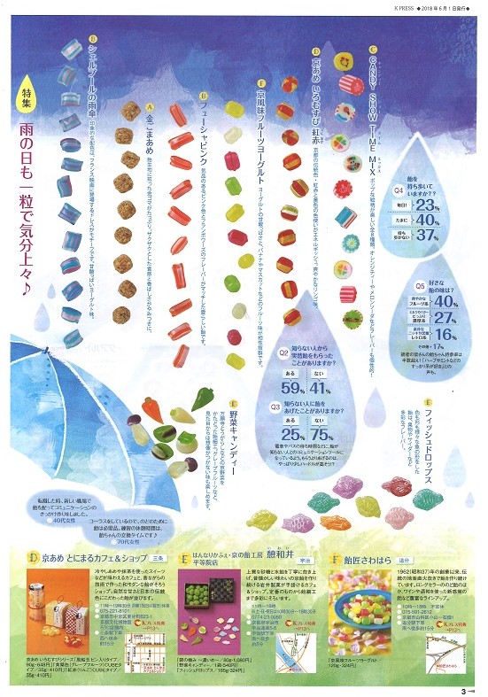 【京阪電車おでかけ情報誌KPRESS6月号】(マイフェイバリット 飴ちゃん)にて、 京あめとにまるの「風船玉、黄檗色(グレープフルーツ)、紅赤(りんご)」 はんなりかふぇ憩和井平等院店の「碧の極み、 野菜キャンディー、 フィッシュドロップス」が紹介されました。 素敵な飴ちゃん載ってます!飴にまつわる情報も載ってます!気になる方は是非ご覧ください!