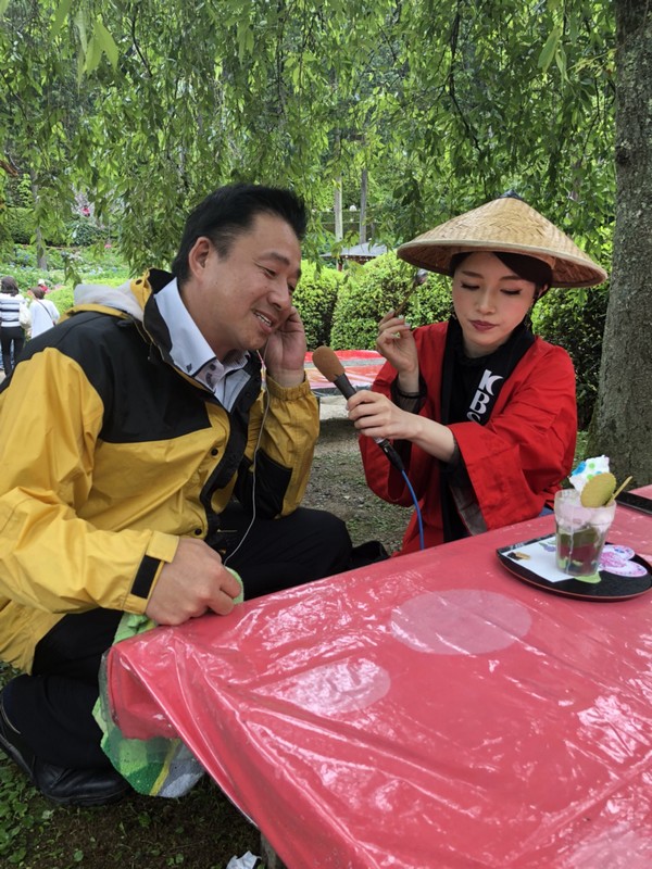 三室戸寺境内「花の茶屋」の新メニュー「ハートあじさいパフェ」が 三室戸寺のあじさいと共にテレビ大阪「やさしいニュース」で生中継で紹介されました。