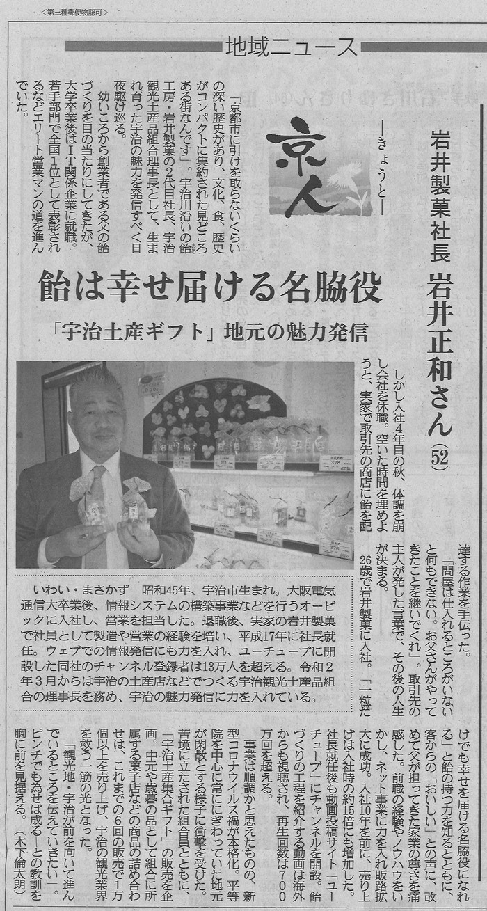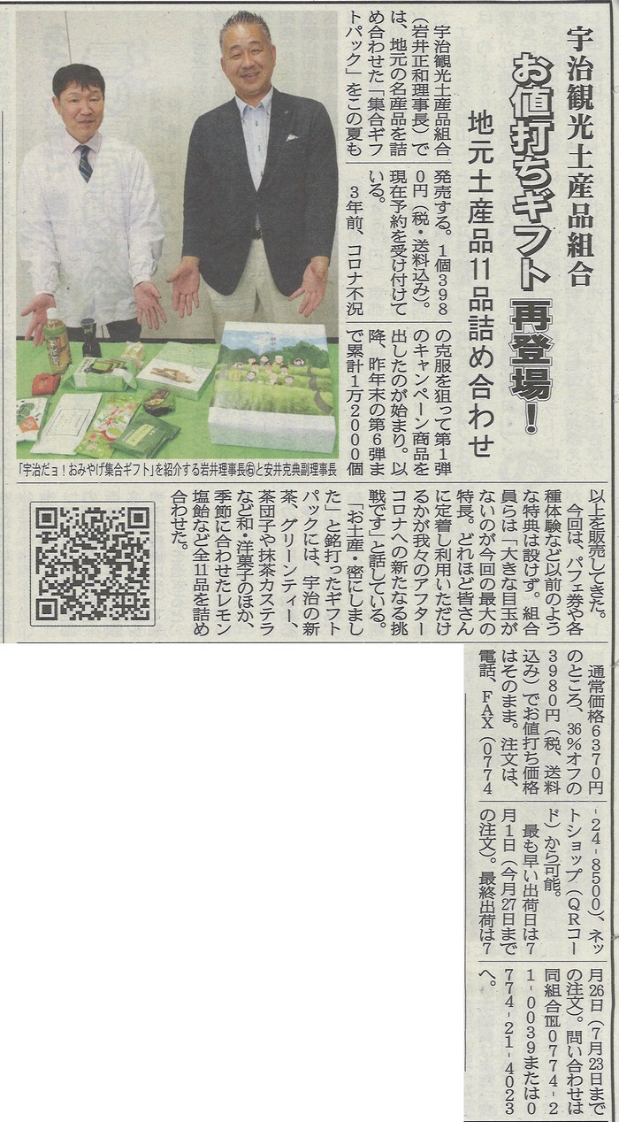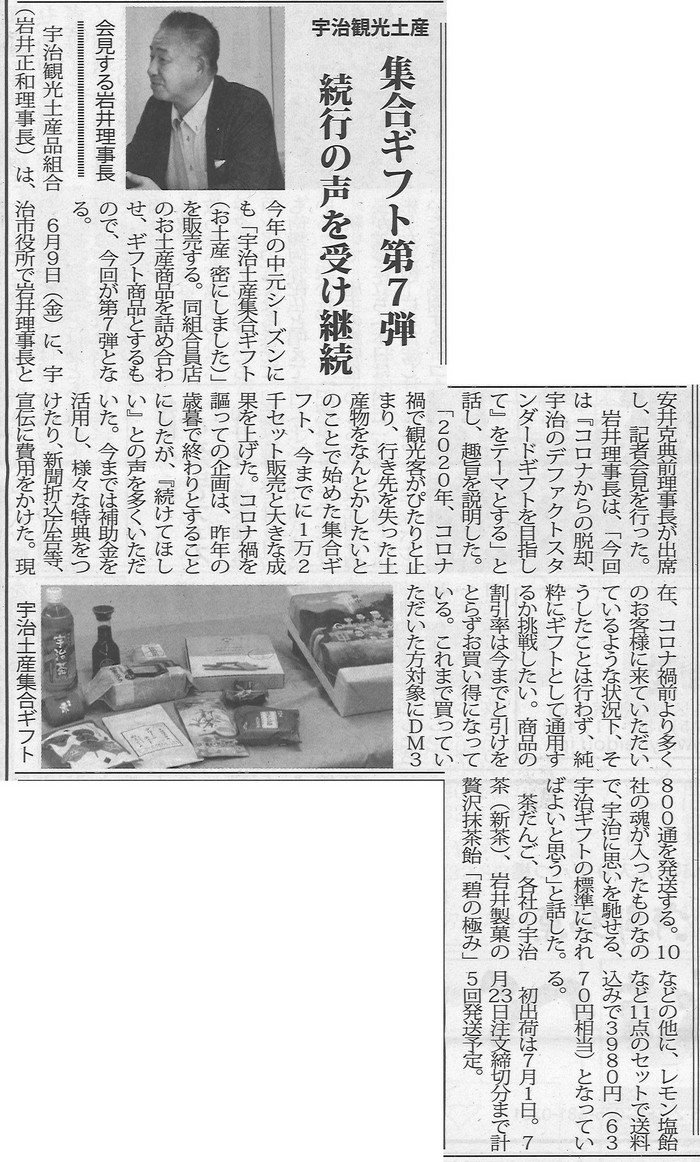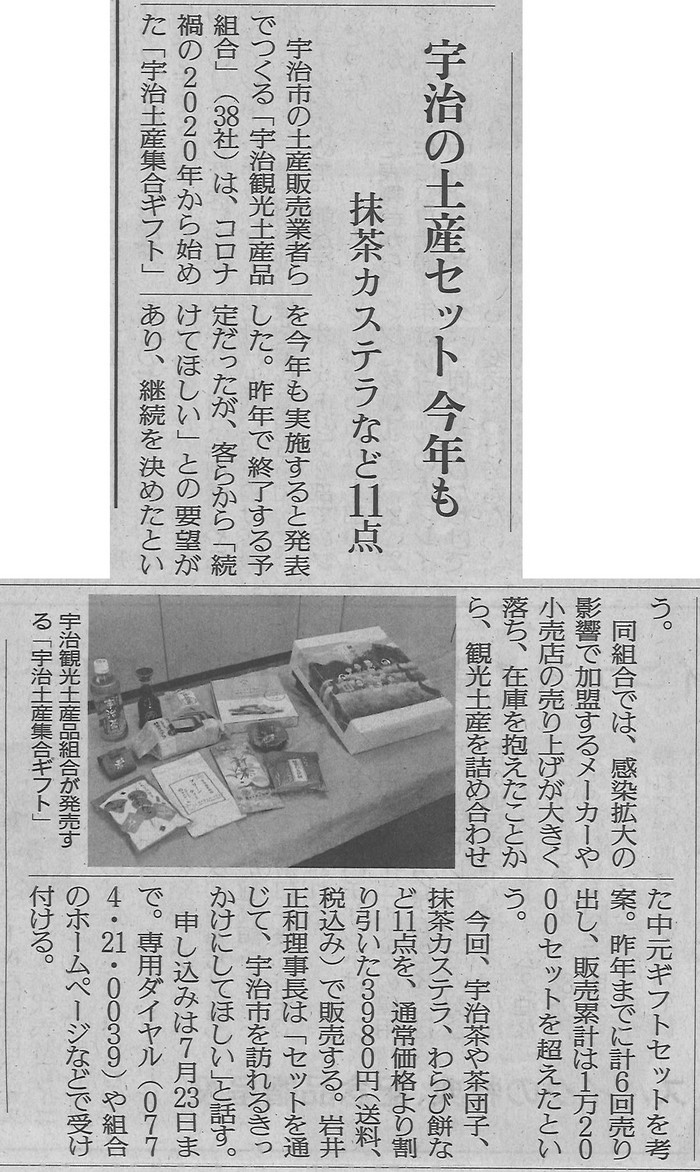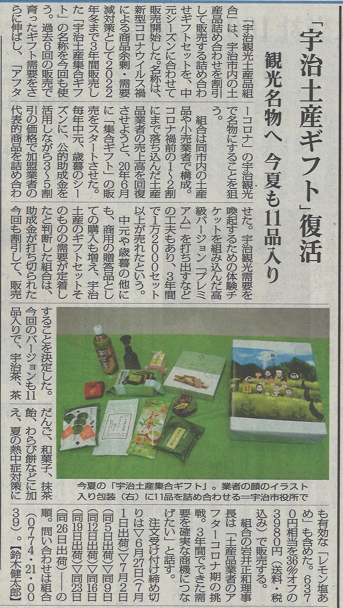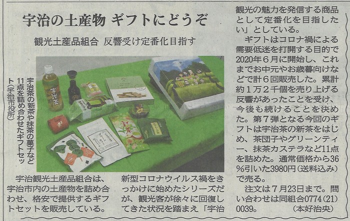 6月28日、京都新聞にて宇治観光土産品組合による第7回目のお中元ギフトが紹介されました。