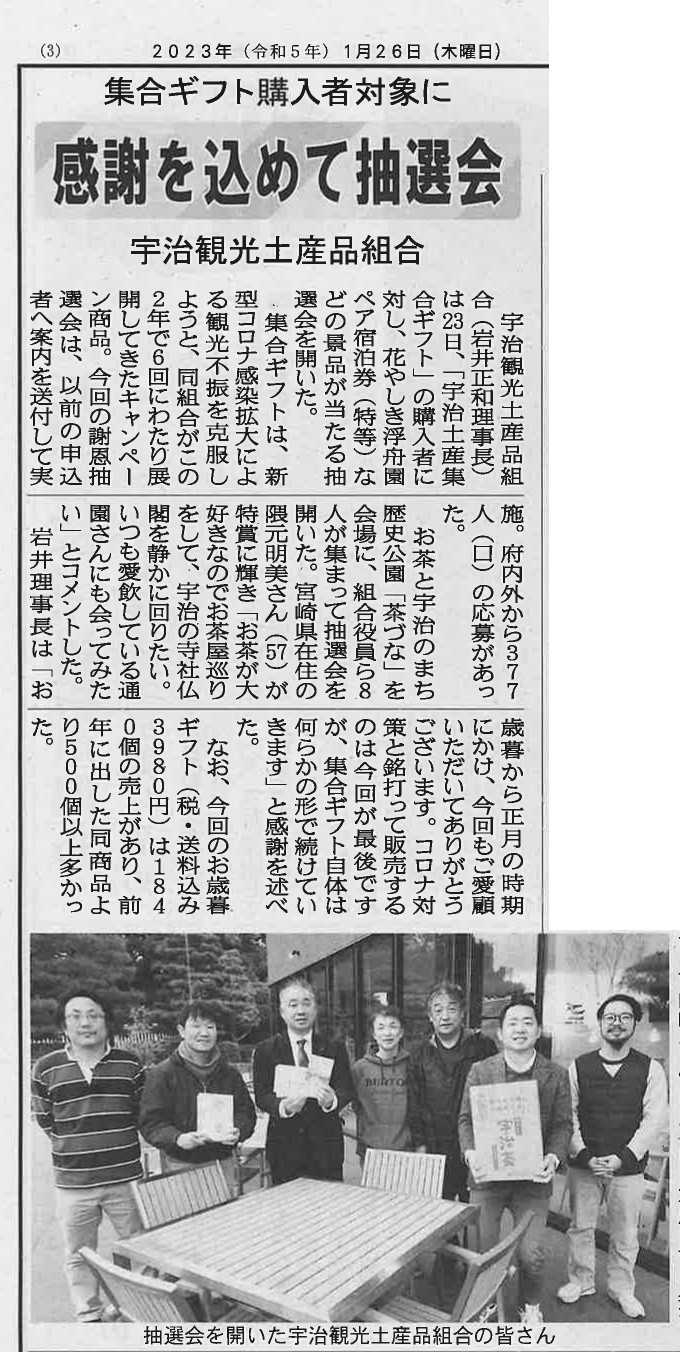 1月26日 洛タイ新報にて、宇治観光土産品組合の集合ギフト購入者が対象となる抽選会の様子が掲載されました。