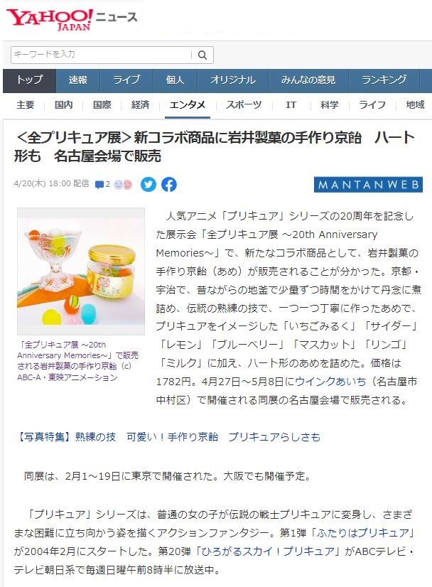 4月20日 Yahoo!ニュースにて、全プリキュア展 新コラボ商品として岩井製菓の手作り京飴が紹介されました。 こちらのコラボ商品は4月27日~5月8日にウインクあいちで開催される同展の名古屋会場で販売されます。 Yahoo!ニュースの記事はこちら |