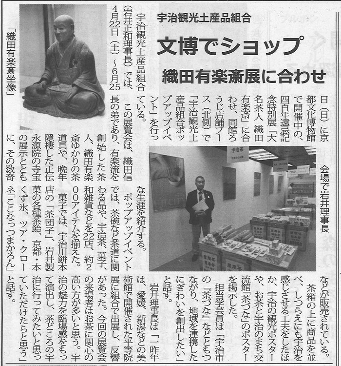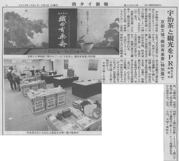 5月2日 洛タイ新報にて、京都文化博物館の特別展「織田有楽斎」と宇治観光土産品組合のコラボとして PRイベントとなる販売会場が紹介されました。