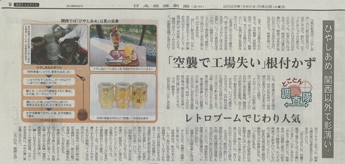 5月2日 日本経済新聞にて当社のひやしあめ、とにまる茶づな本店のひやしあめパフェなどが掲載されました。
