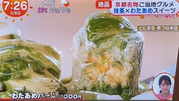 5月8日 めざましテレビ「FNSご当地うま撮GP」コーナー内にて、とにまる茶づな本店のわたあめバームが紹介されました。