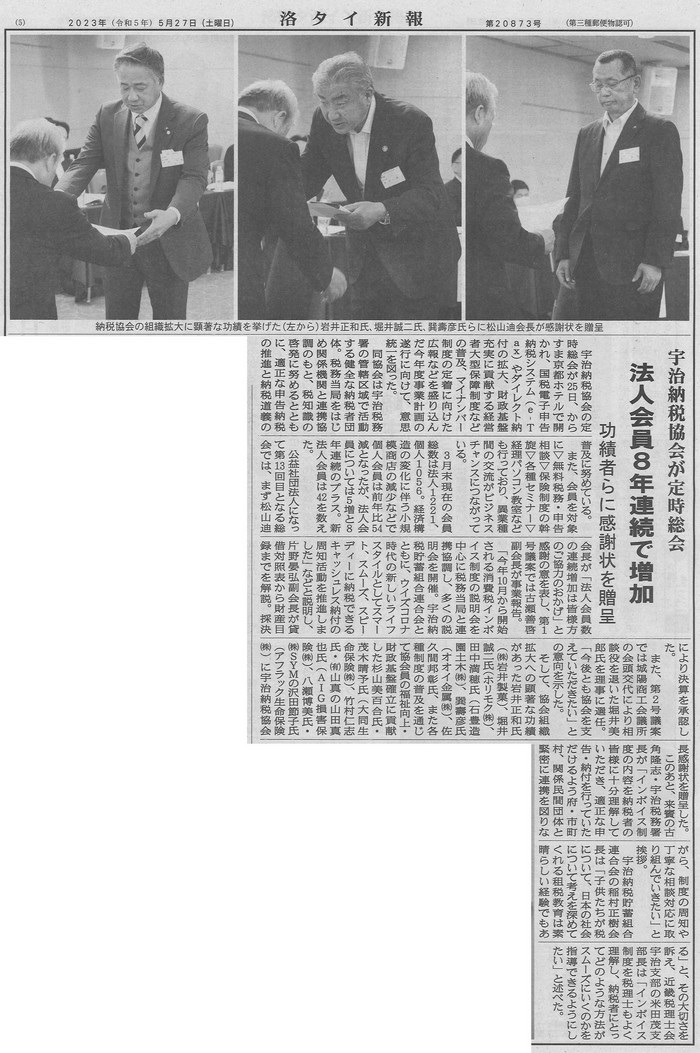 | 5月27日 洛タイ新報にて宇治納税協会の定時総会に関する記事が掲載 |