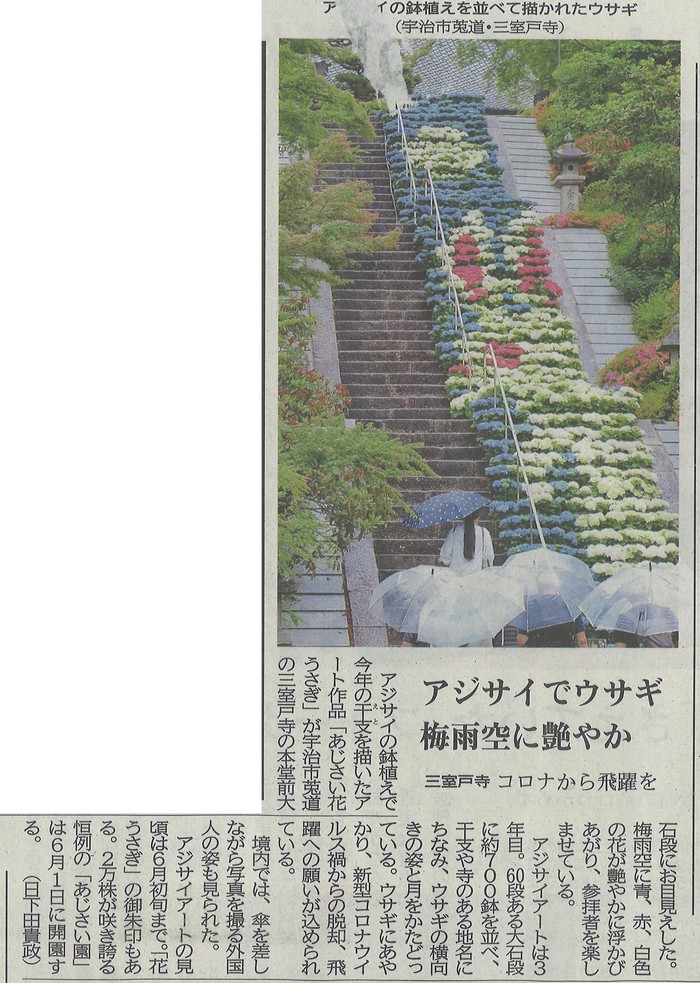 | 5月30日 朝日新聞にて、三室戸寺のあじさいアートが紹介 |