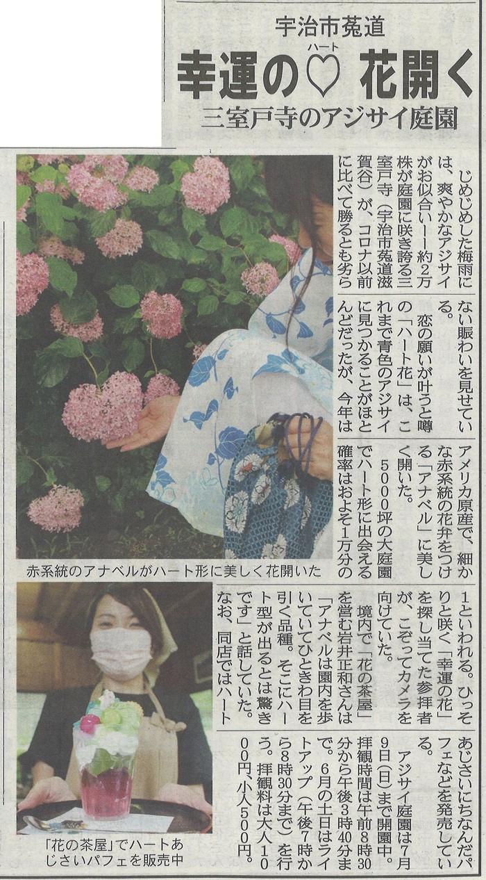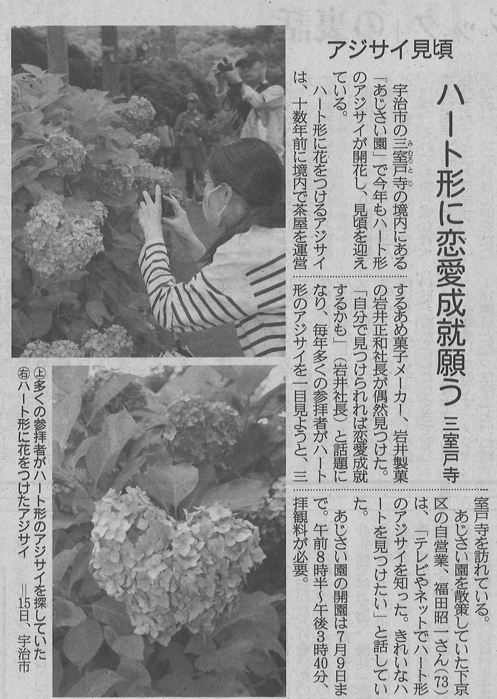 6月16日 産経新聞にて、三室戸寺のハートマークあじさいが紹介されました。