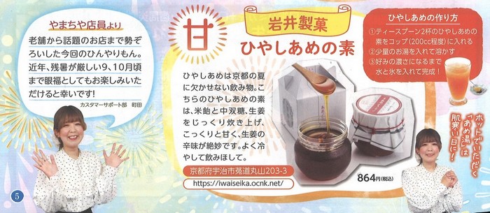| 京都やまちや様の会報誌「和ごころ 真ごころ」2023年7・8・9月号でひやしあめの素が紹介 |