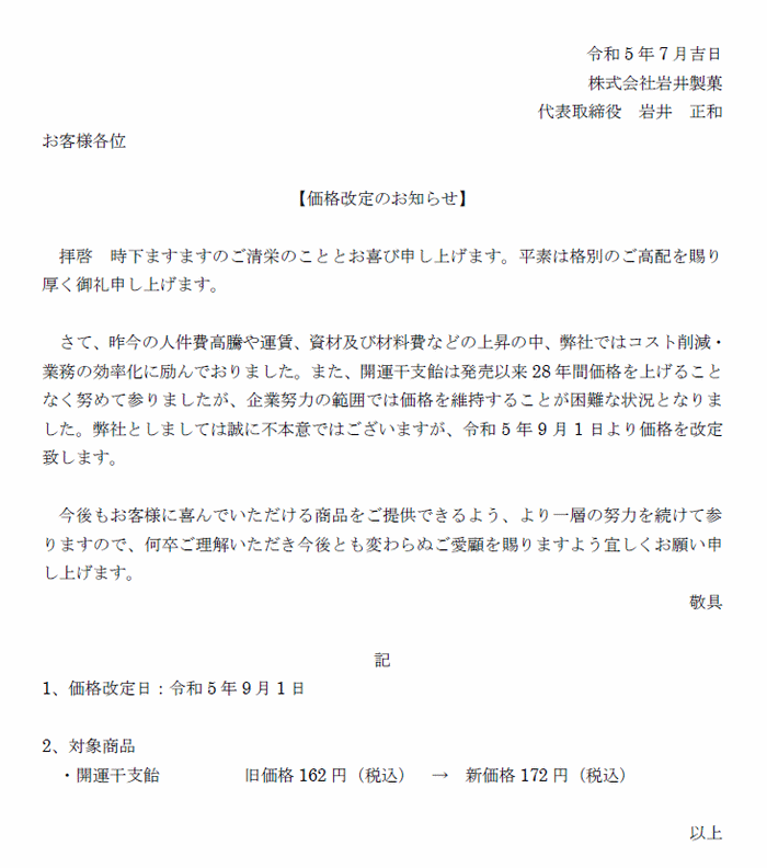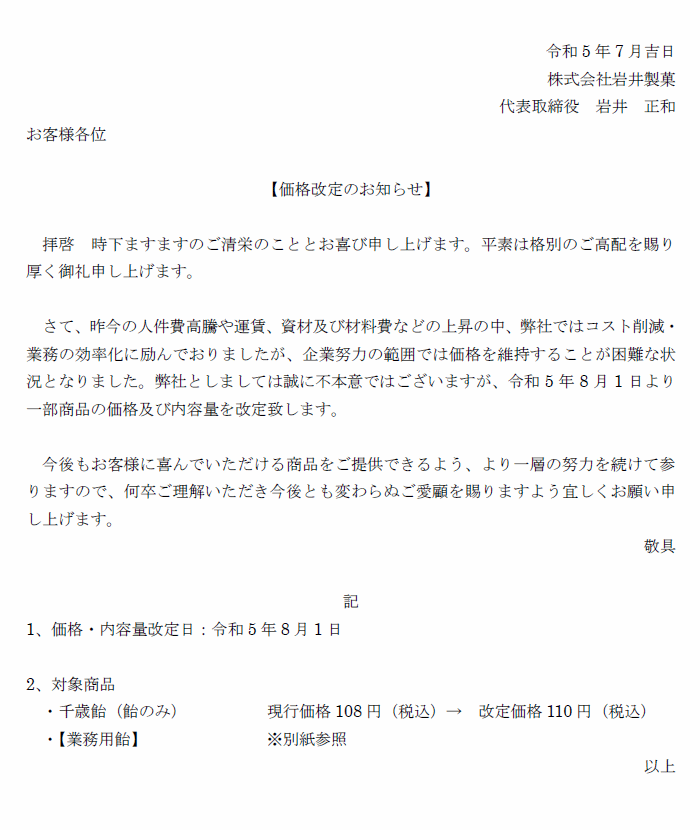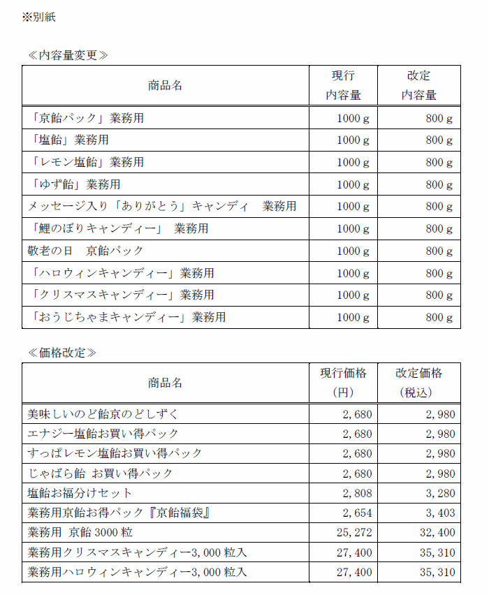 | 価格改定のお知らせ「千歳飴、業務用飴」(令和5年8月1日より) |