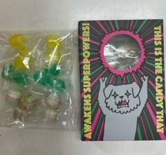 展覧会オリジナルグッズ 支給頂いたパッケージにレモン、サイダー、錦玉の3種類を詰めました。
