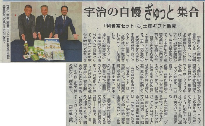 11月22日 毎日新聞にて、宇治観光土産品組合によるお歳暮集合ギフト(第8弾)の記者会見発表会が掲載されました。