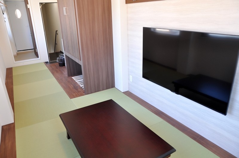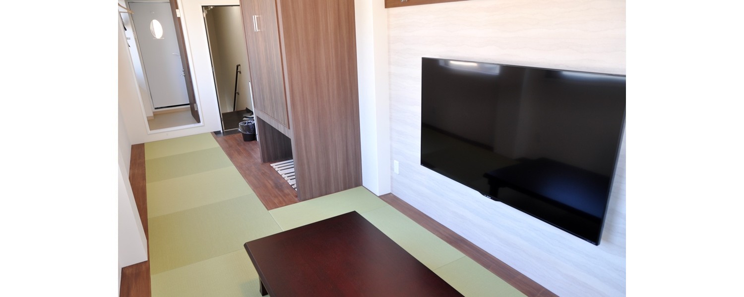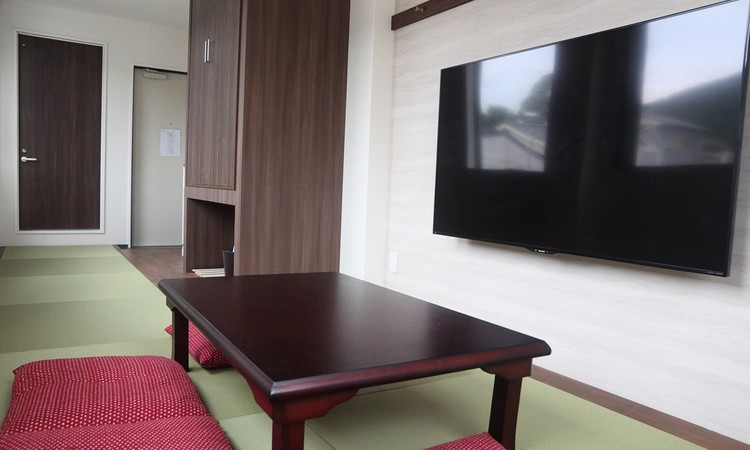 家族で落ち着ける畳敷きのお部屋です。部屋からは三重塔が見え、テレビは60インチの大画面です。