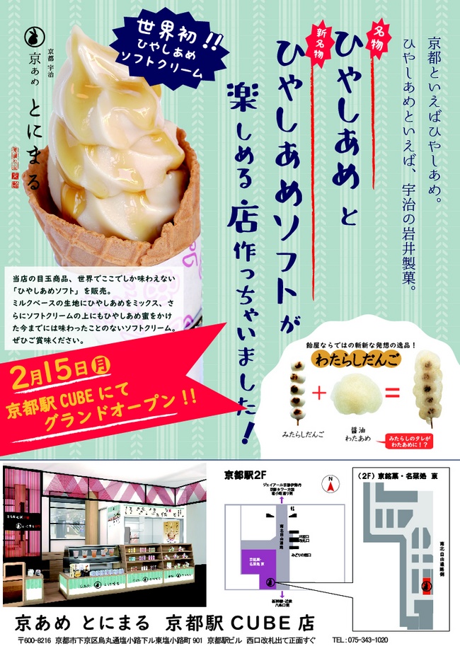 2月15日 京都新聞のWebサイトにて、ひやしあめ専門店「京あめ とにまる 京都駅cube店」オープンの記事が掲載されました。