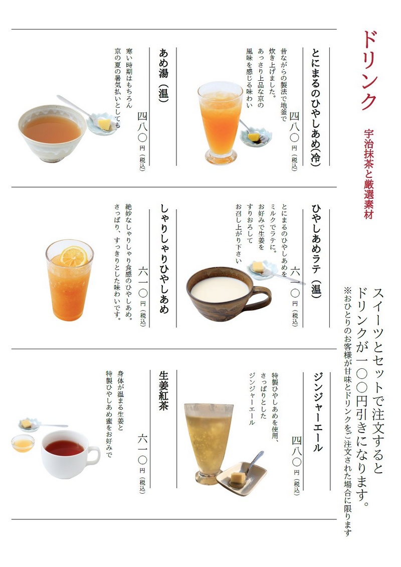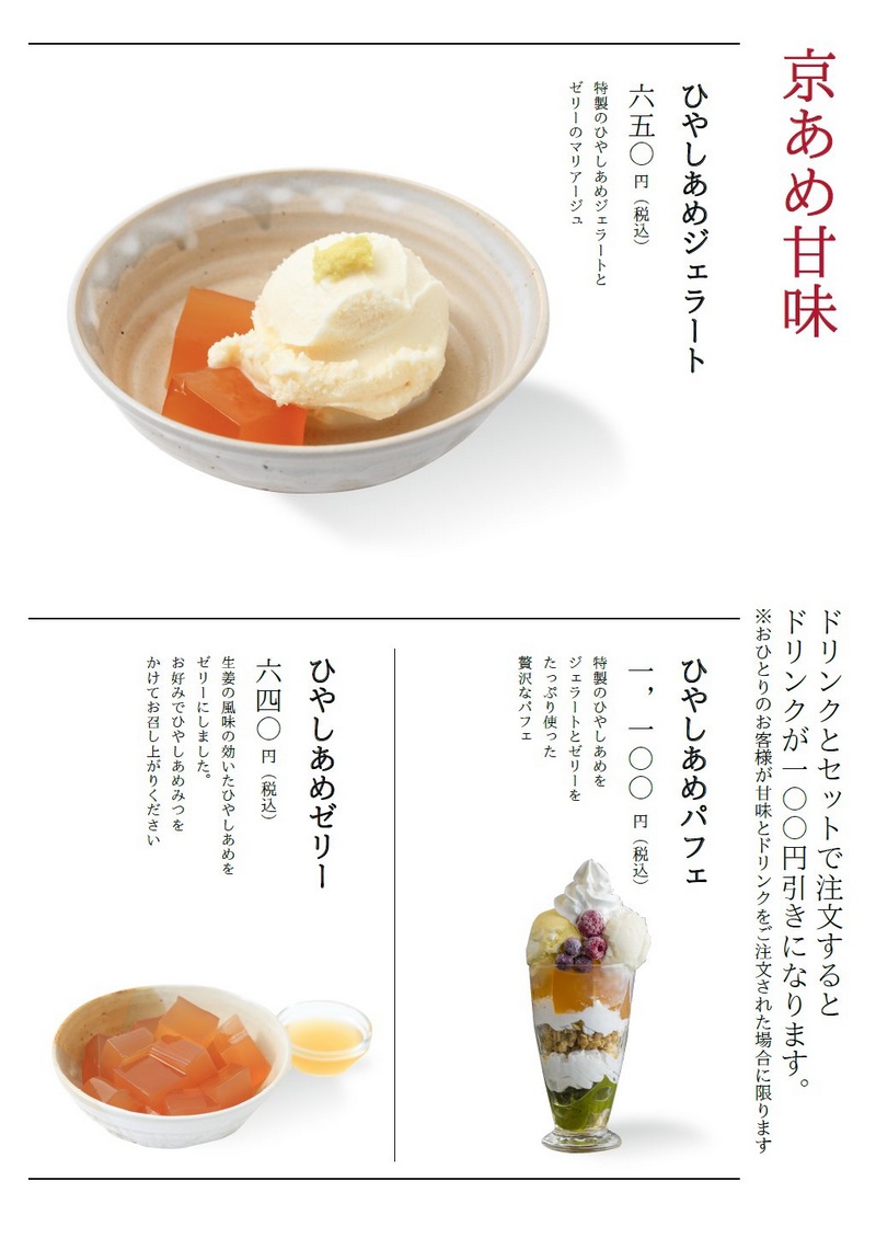 代表商品の「とにまるのひやしあめ」でつくる「ひやしあめパフェ」、あめ職人特製の“蜜”を使用したあめ屋ならではのスイーツ、